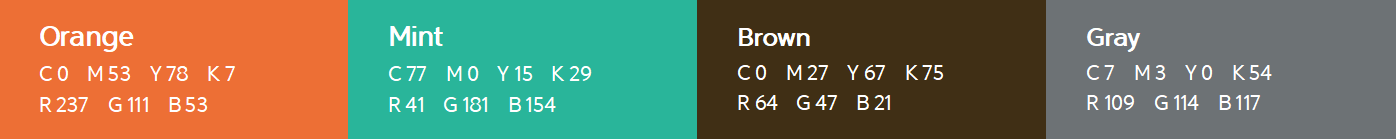 민트는 친환경 그리고 균사체, 에너지를 의미합니다. 가장 어두운 갈색은 고급스러운 좋은 빛깔의 대지를 의미합니다.